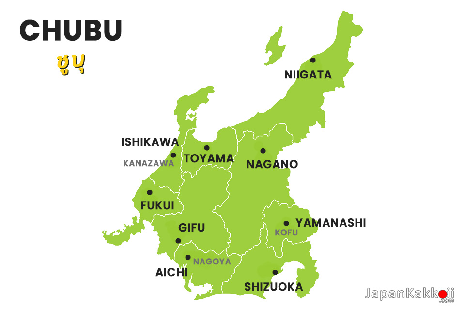 ภูมิภาคชูบุ (Chubu) ตั้งอยู่ตอนกลางของประเทศบนเกาะฮอนชู และเป็นที่ตั้งของภูเขาไฟฟูจิซึ่งเป็นภูเขาไฟสัญลักษณ์ของประเทศญี่ปุ่น รวมถึงแนวเทือกเขาเจแปนแอลป์อันงดงาม ประกอบด้วย 9 จังหวัด ได้แก่ นีงาตะ โทยาม่า อิชิคาว่า ฟุกุอิ ยามานาชิ นากาโน่ กิฟุ ชิสึโอกะ และไอจิ