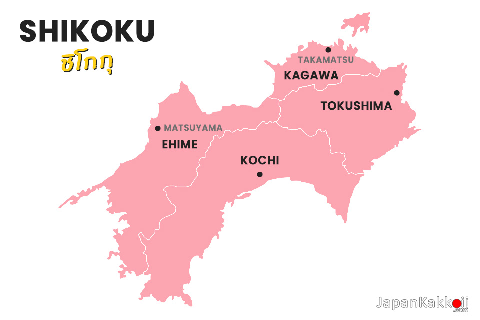 ภูมิภาคชิโกกุ (Shikoku) เป็นเกาะที่มีขนาดเล็กที่สุดในบรรดาเกาะหลักของญี่ปุ่น ทางทิศตะวันออกจรดทิศตะวันตกรายล้อมด้วยเกาะฮอนชู (Honshu) และเกาะคิวชู (Kyushu) ประกอบด้วย 4 จังหวัด ได้แก่ โทคุชิมะ คางาวะ เอฮิเมะ และโคจิ