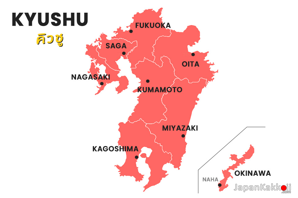 ภูมิภาคคิวชู (Kyushu) เป็นเกาะที่ตั้งอยู่ทางตะวันตกเฉียงใต้และเป็นหนึ่งในสี่เกาะหลักของญี่ปุ่น ประกอบด้วย 7 จังหวัด ได้แก่ ฟุกุโอกะ ซากะ นางาซากิ คุมาโมโตะ โออิตะ มิยาซากิ และคาโกชิม่า ส่วนหมู่เกาะโอกินาว่า (Okinawa) ซึ่งแยกออกไปทางใต้ของคิวชู เป็นอีก 1 จังหวัดของประเทศญี่ปุ่น ทำให้โอกินาว่าเป็นจังหวัดที่อยู่ใต้สุดของประเทศ