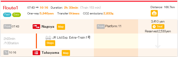 ค่าโดยสารรถไฟ Nagoya – Takayama