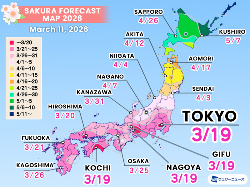 - ซากุระสายพันธุ์โซเมอิโยชิโนะ จะเริ่มบานในวันที่ 19 มีนาคม ที่โตเกียว นาโกย่า กิฟุ และโคจิ จากนั้นในวันที่ 20 มีนาคม จะเริ่มบานที่ฮิโรชิม่า