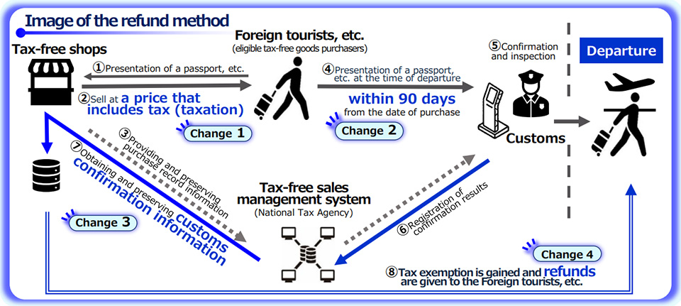 อย่างไรก็ตาม ตั้งแต่ 1 พฤศจิกายน 2026 ญี่ปุ่นจะเปลี่ยนระบบการซื้อสินค้าปลอดภาษีมาเป็นระบบซึ่งเรียกว่า “Tax Refund Method” โดยจะต้องซื้อสินค้าในราคาที่รวมภาษีก่อน แล้วค่อยนำสินค้าไปให้ศุลกากรตรวจยืนยันตอนออกนอกประเทศ (ภายใน 90 วันนับจากวันถัดจากวันที่ซื้อ) จึงจะได้รับเงินภาษีคืนภายหลัง